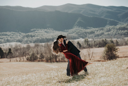 Cades Cove is one of my favorite locations in the Smoky Mountains for Engagement Sessions and Elopements! Cades Cove offers panoramic mountain views, sweeping rivers and streams, and wooded trails showing off the National Park's diverse ecosystem! Chloe and Cole envisioned soft and romantic engagement photos that showed off their love and captured the beauty of the Smoky Mountains! Chloe went with a stunning red velvet dress to really tie together the romantic and elegant theme for their engagement photos!