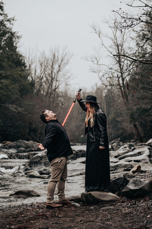 Morgan and Garrett were so much fun to photograph! I loved getting to know them as a couple and creating an experience for their engagement photos that were unique to them! Morgan loves all things spooky and moody and they’re planning a “Friday the 13th” themed wedding so that was the theme we went with for their engagement photos. They incorporated lightsabers and wands and made the session as unique to them as possible. It was SO fun! And now, I can’t wait to photograph their Friday the 13th wedding this upcoming year!! Come see more of this moody engagement session in Knoxville, Tennessee below!